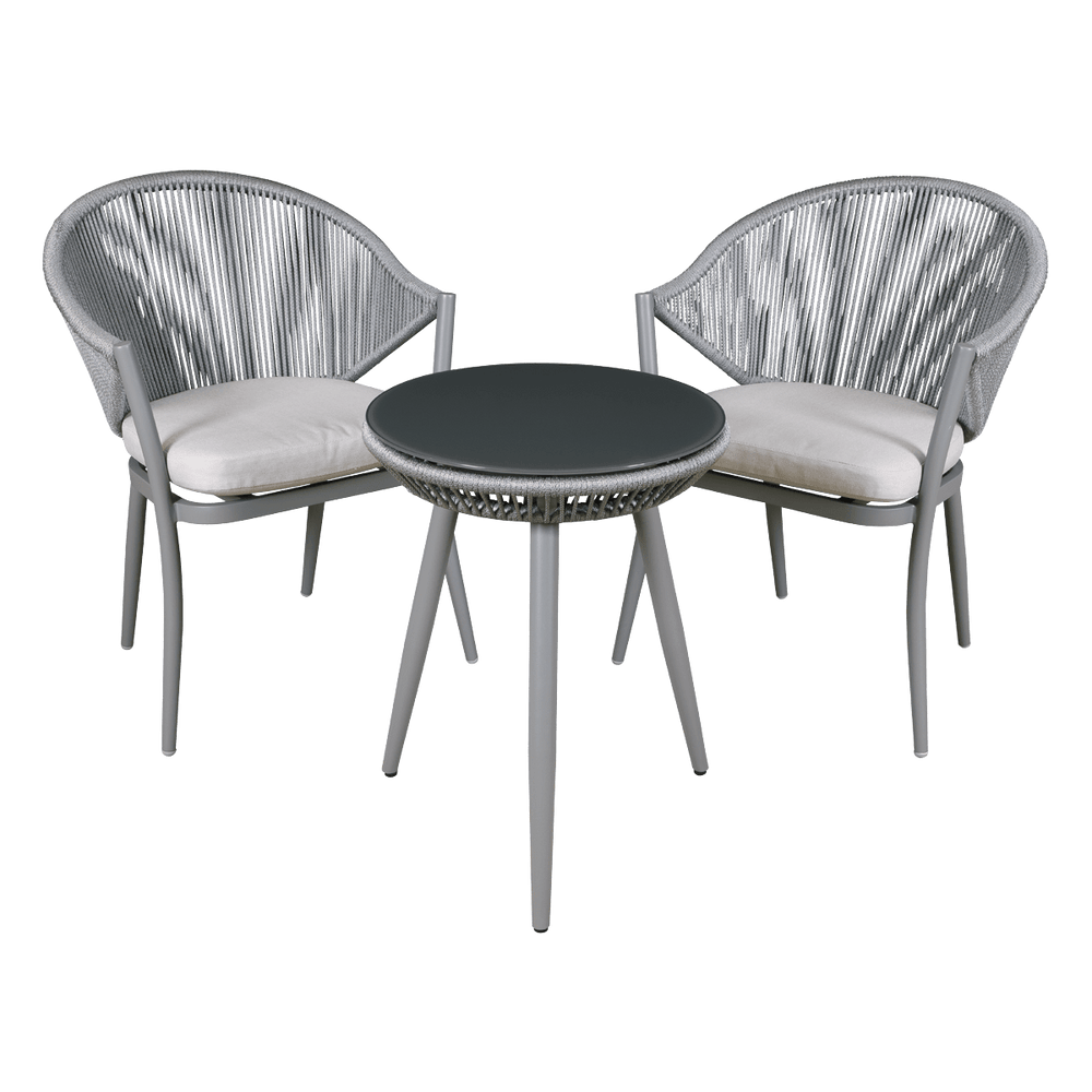 The set includes two ergonomically designed chairs with plush 5 cm thick seat cushions and a tripod table topped with 5 mm shatterproof tempered glass. Whether you're enjoying a morning coffee or relaxing in the sun, this set offers a perfect blend of modern aesthetics and practical comfort.
