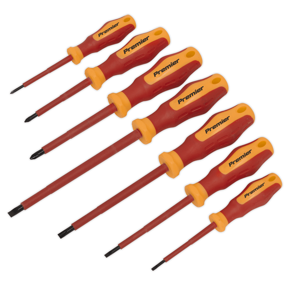 The Sealey AK6125 Screwdriver Set, available from Trade Counter Direct, is a professional-grade 7-piece set designed for technicians working on modern hybrid and electric vehicles. Manufactured with high quality S2 steel shafts, each screwdriver features magnetic and corrosion resistant tips for reliable performance. The set is fully insulated to VDE and EN 60900 standards, ensuring protection from electric shocks up to 1000V.