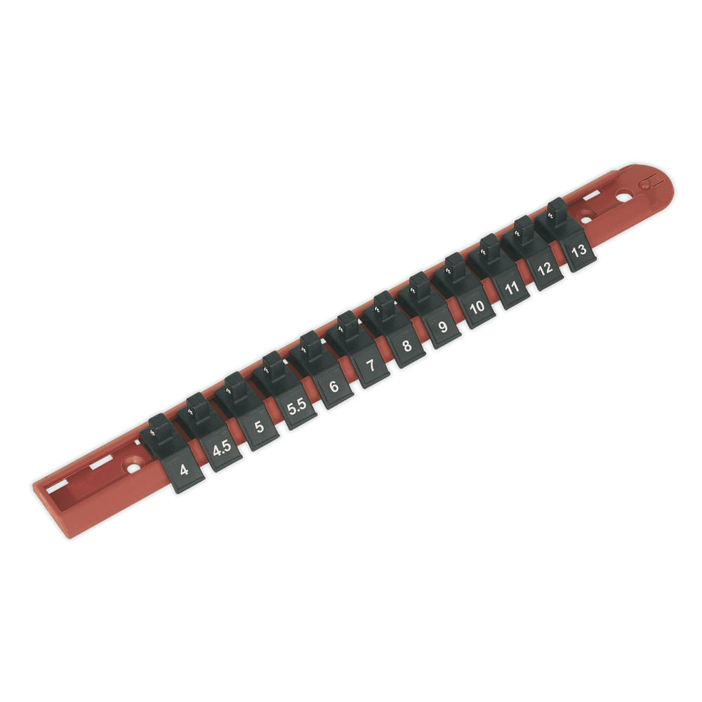 The Sealey AK1412 Socket Retaining Rail with 12 Clips is a robust and practical solution for organising your sockets, now available from Trade Counter Direct. Designed for daily professional use, this durable composite sliding socket rail ensures efficient storage and easy access to your 1/4" square drive sockets. Each socket clip is clearly marked with its size, streamlining selection and improving workflow in busy environments.