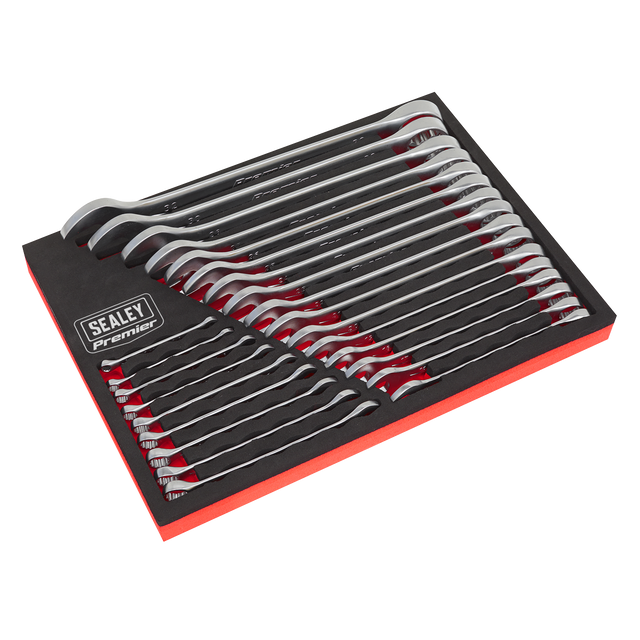 The Sealey AK63258 Combination Spanner Set, available from Trade Counter Direct, is a comprehensive 25-piece metric set designed for professional and trade use. Manufactured from high-quality Chrome Vanadium steel with a satin polished finish, these slim style spanners offer both durability and corrosion resistance. Each spanner features an open-end and a 12-point WallDrive® ring, ensuring versatility and reliable grip across a wide range of applications. The set is neatly organised in a robust EVA storage tray for convenient access and protection.