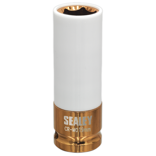 The Sealey SX03019 Alloy Wheel Impact Socket 19mm 1/2" Sq Drive is designed for professional use with impact tools, offering reliable performance and enhanced protection for alloy wheels. Available from Trade Counter Direct, this socket is manufactured from high-quality chrome molybdenum, ensuring durability and resistance to corrosion. Its sleeved design and colour-coded finish make it an essential addition to any automotive toolkit, particularly for those working with alloy wheels.