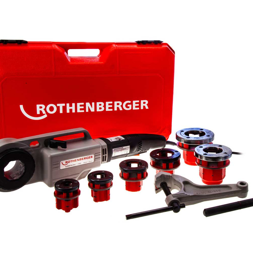 Supplied in a robust carrying case, the Supertronic 2000 set includes a selection of die heads to accommodate various pipe sizes, ensuring versatility and convenience for professionals seeking reliable threading solutions on site.