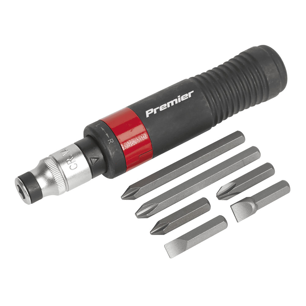 The Sealey AK2085 1/2" Square Drive Impact Driver Set is a robust and reliable solution for professionals seeking effective fastening and loosening of stubborn screws and bolts. Available from Trade Counter Direct, this heavy-duty hand tool features a contoured grip for comfortable use and a durable phosphate finish for enhanced longevity. Supplied as a comprehensive kit, it is suitable for daily professional applications and includes a selection of Chrome Vanadium steel driver bits and an 8mm hex drive adaptor.