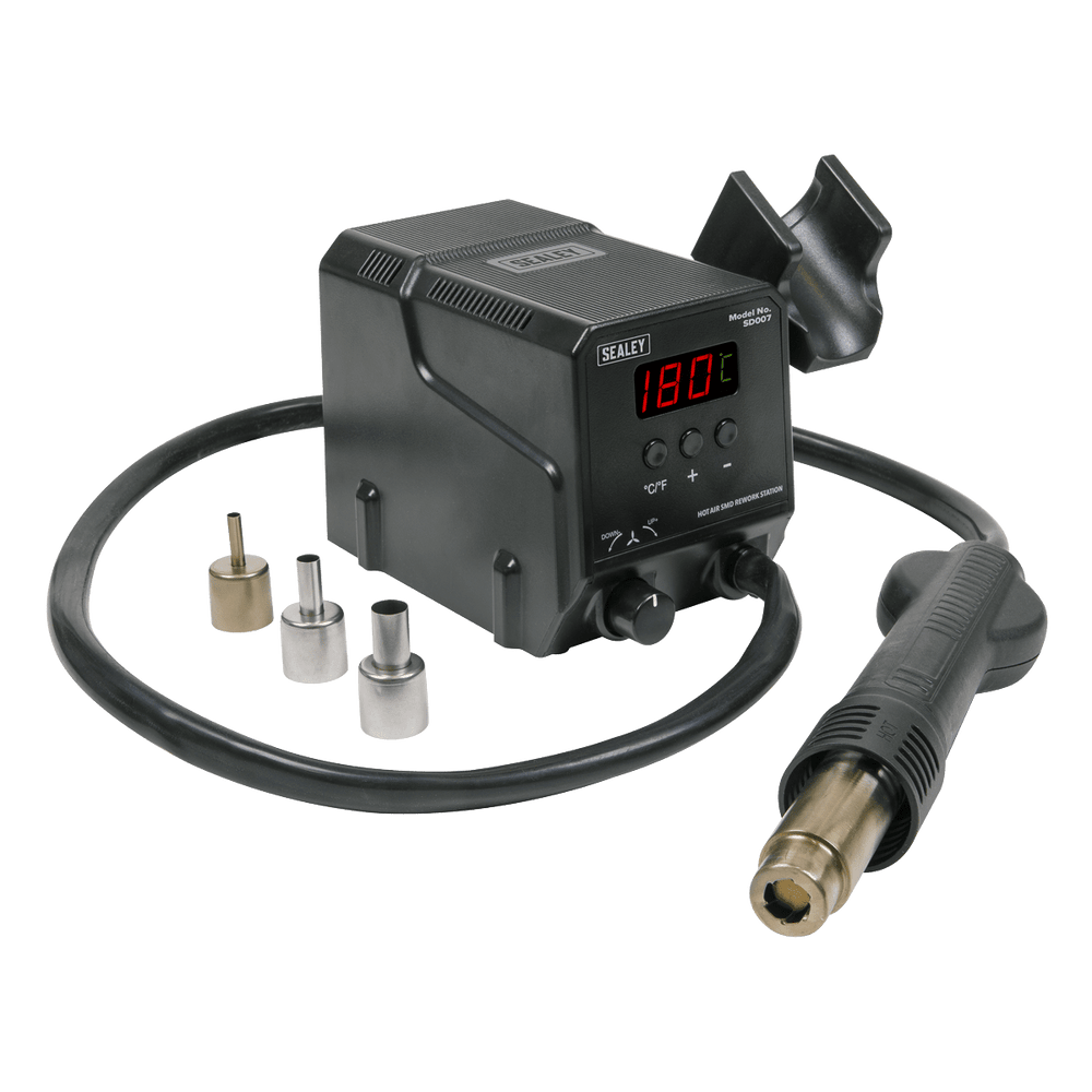 The Sealey SD007 Hot Air Rework Station, available from Trade Counter Direct, is designed for precision desoldering and rework tasks on a wide range of electronic components. Featuring a 300W power output and an automatic cooling system, this station ensures efficient operation and extended tool life. The integrated LED digital display provides clear, real-time feedback on temperature and operational status, supporting accurate and stable control for professional results.