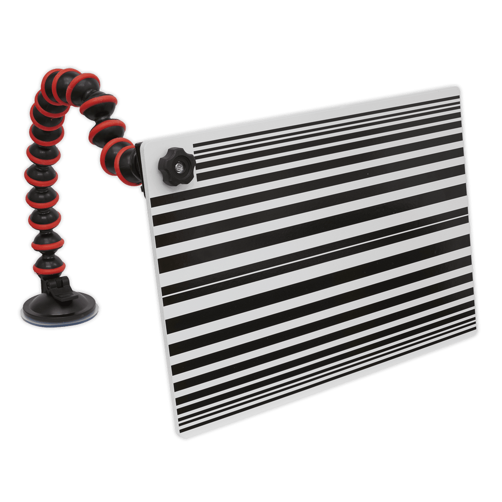 The Sealey RE025 PDR Line Board is an essential accessory for precision dent repair, available from Trade Counter Direct. Designed to be used alongside other dent repair tools, this reflective board aids in achieving accurate results when dressing vehicle panels. Its innovative design features a suction cup and flexible neck, enabling precise positioning for optimal visual guidance during paintless dent repair (PDR) tasks.