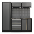 Constructed with a tough hammered metal finish and equipped with aluminium handles and drawer pulls, the Sealey APMSSTACK02SS offers a blend of strength and practicality. The modular design allows for flexible configuration, while heavy-duty drawers and gas strut-assisted wall cabinet doors ensure smooth operation and secure storage.