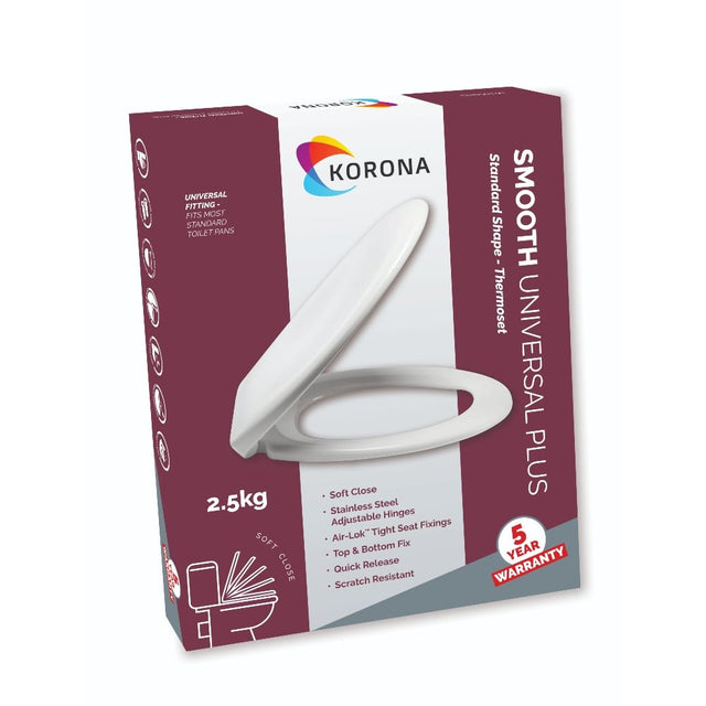 The Korona Soft Close Top Fix Metal Hinge Toilet Seat, available from Trade Counter Direct, is engineered for durability, convenience, and a modern aesthetic. Designed to fit most standard toilet pans, this seat features robust stainless steel hinges and a scratch-resistant UF (Dura-Plas) construction, making it ideal for both professional plumbers and domestic installations. Its soft close mechanism ensures quiet operation, while the quick release function simplifies cleaning and maintenance, enhancing hygiene in any bathroom setting.