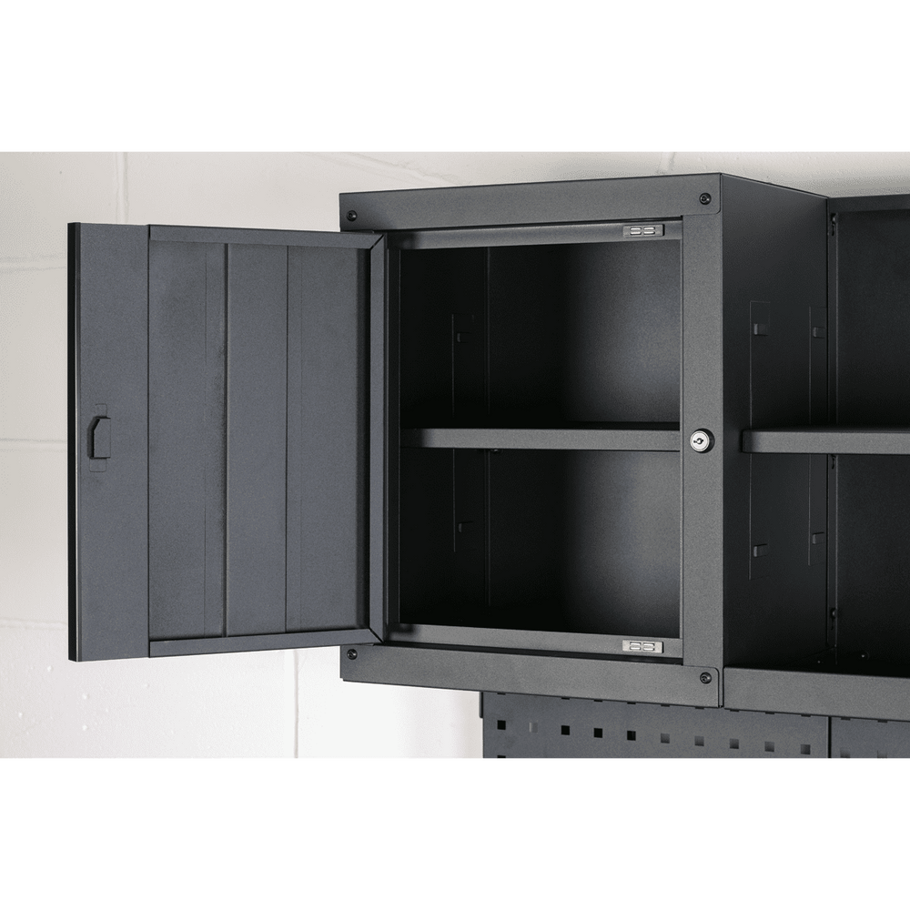 • Two cupboards and a pegboard back panel for versatile storage options