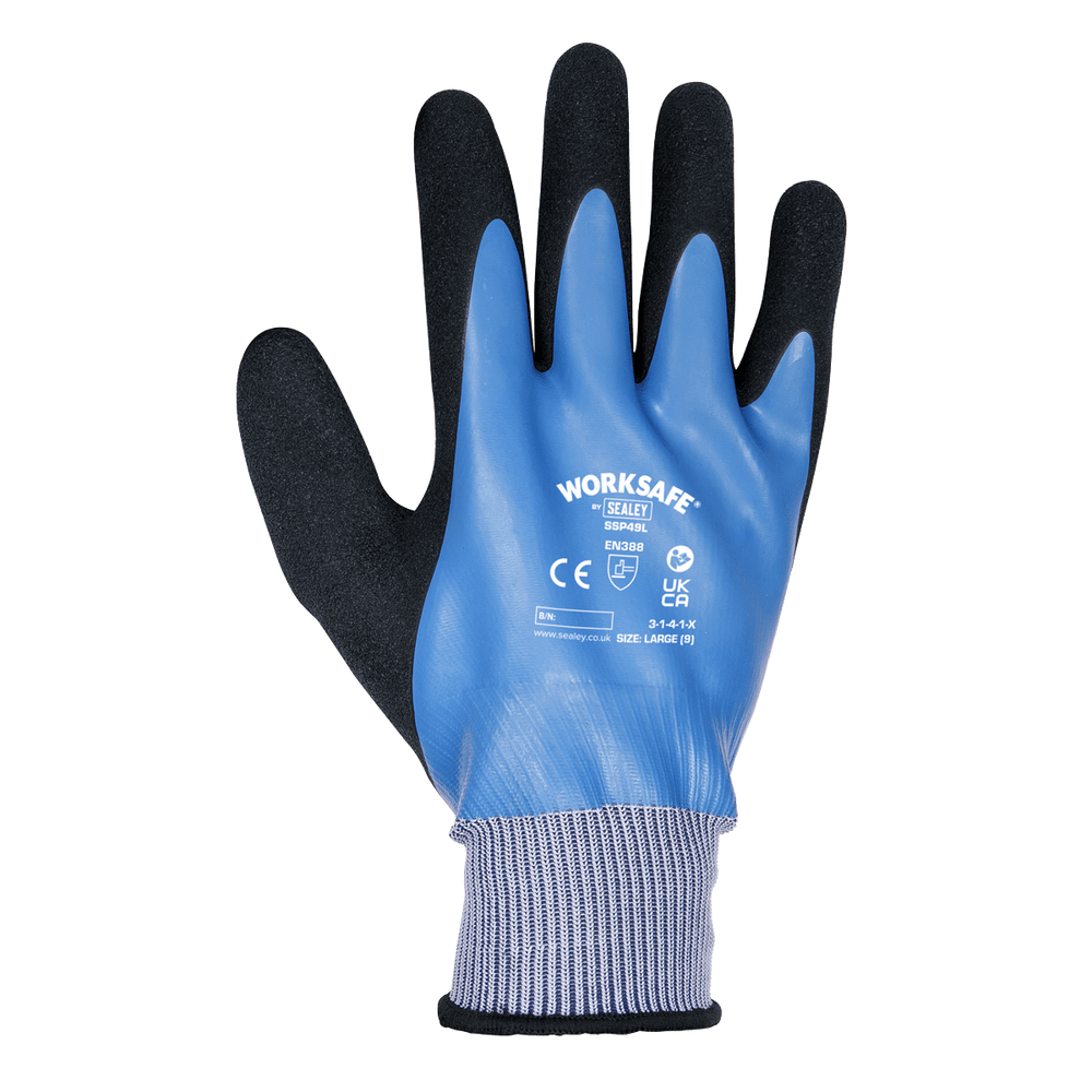 Trade Counter Direct offers the Sealey SSP49L/6 Worksafe Waterproof Latex Gloves, designed for reliable hand protection in demanding wet and oily environments. These large, knitted wrist gloves feature a smooth latex coating that provides excellent resistance to water, oil, and grease, making them ideal for a wide range of industrial and trade applications. The extra textured palm ensures superior grip and control, while maintaining flexibility and comfort throughout extended use.