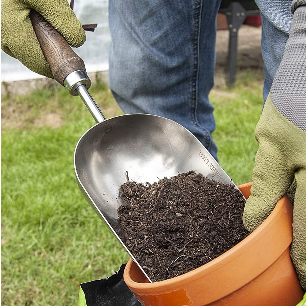 With a stainless steel head for strength and longevity, a contoured wooden handle for comfortable grip, and a leather hanging strap for convenient storage, this Stanley garden scoop combines practicality with classic styling.